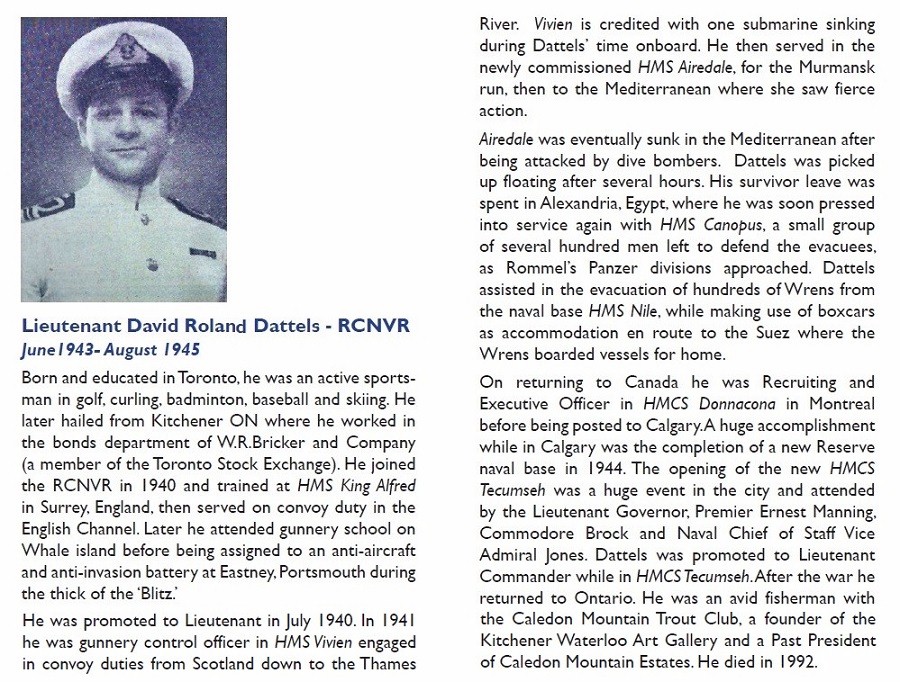 Ships served in: * Listed as an A/Lt, RCNVR (seniority 24 Jul 1940) (Navy List Aug 1940) HMS KING ALFRED * Appointed Lt (seniority 24 Jul 1940) (Navy List Dec 1940) HMS VIVIEN HMS AIREDALE - Served in AIREDALE on the Murmansk Run and in the Mediterranean. Survived the sinking of AIREDALE HMS CANOPUS HMCS STADACONA - Appointed to STADACONA as a Lt, RCNVR (Navy List Sep 1942) HMCS DONNACONA - Served in DONNACONA as Recruiting Officer and X.O. (Article from The Ensign Spring 2020) HMCS TECUMSEH - Appointed to TECUMSEH 30 Jun 1943 as an A/LCdr, RCNVR, CO * Appointed LCdr, RCNVR (seniority 01 Jul 1944) (Navy List Jul 1944) * Retired List as a LCdr, RCN(R) (seniority 01 Jul 1944) (Navy List Apr 1946) HMCS STAR (Retired List) as a LCdr, RCN(R) (Navy List Jul 1952) * Lasted noted on the Retired List at HMCS STAR as a LCdr, RCN(R) (seniority 7 yrs. 62 days) (Navy List Jan 1960)