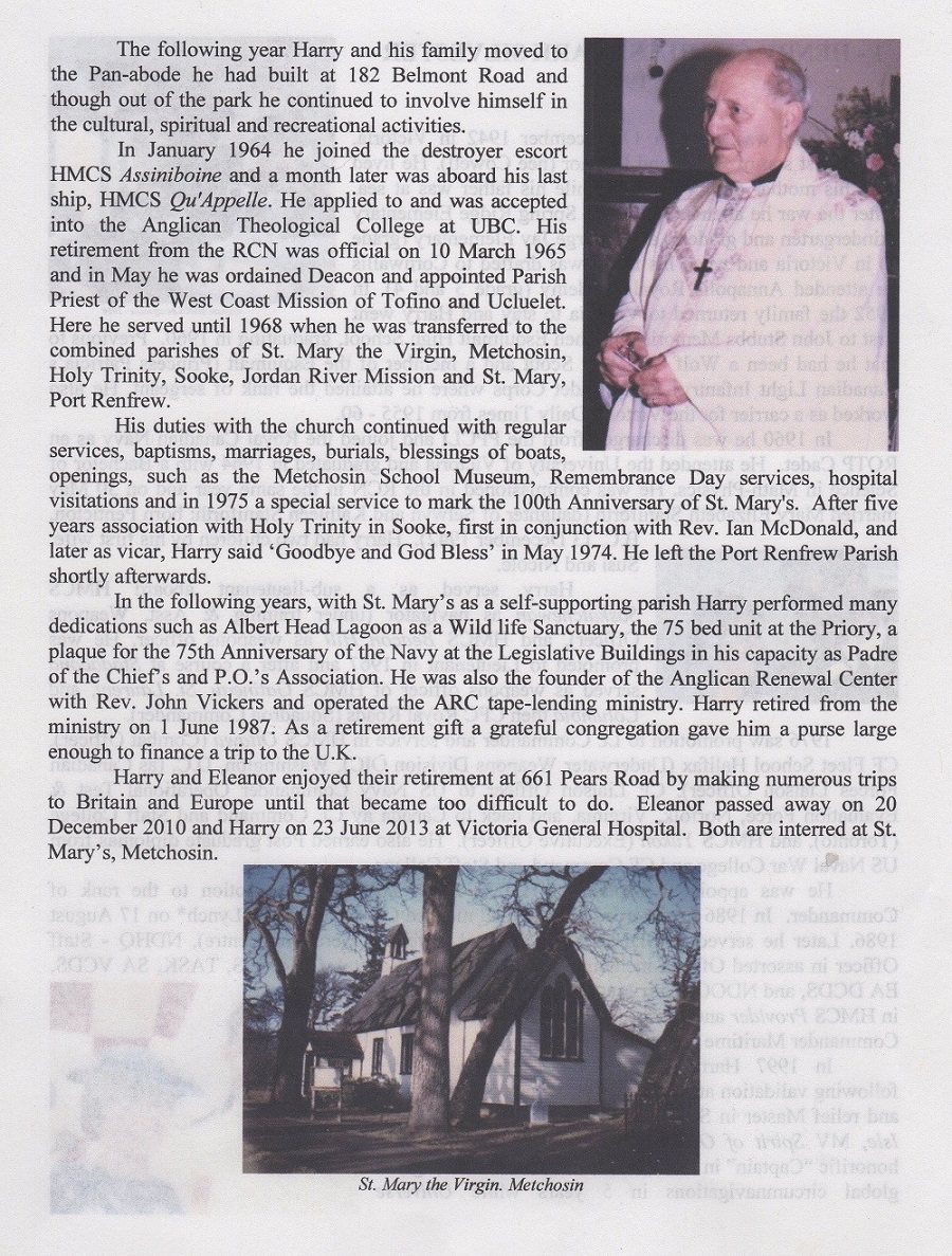 SILVESTER, Henry (Harry) - The Rev. Harry Silvester passed away peacefully on June 23, 2013 at the age of 93. He will be missed by his sons Harry (Catherine), Bill (Winnie), Ken (Jokie), Tim (Catherina), 10 grandchildren and 14 great-grandchildren, his brother Jim, brother-in-law Steve and many nieces, nephews and friends. Harry was born in Edinburgh, Scotland in December 1919 and immigrated to Canada in 1921 with his mother to join his father in Winnipeg. He enlisted in RCNVR in 1936 and was amongst the first called up when war was declared in 1939. He served in the Battle of the Atlantic throughout most of the war and afterwards remained in the RCN until he retired in 1965 as Chief Petty Officer 1st Class. He was ordained in the Anglican Church and served the West Coast Mission in Tofino and Ucluelet before being transferred in 1968 to the combined parishes of Sooke, Port Renfrew and Metchosin. In 1974 his duties were confined to St. Mary the Virgin in Metchosin. He also served as Padre for the Legion and Chief's & P.O.'s Association. He retired again in 1987. He was predeceased by his beloved wife, Eleanor, in December 2010. There will be a memorial service for Dad at 1 pm, June 28, 2013, at St. Mary of the Incarnation, 4125 Metchosin Road, Rev. John McQuarrie officiating. Many thanks to the staff at Victoria General Hospital. In lieu of flowers donations may be made to www.cysticfibrosis.ca or www.diabetes.ca