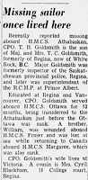 GOLDSMITH, Thomas Henry Hardy, CYS, 2980, RCN killed - 29 Apr 1944, HMCS ATHABASKAN - Son of Thomas Charles and Lillian Hardy Goldsmith; husband of Amy Pauline Goldsmith, of Victoria, British Columbia.