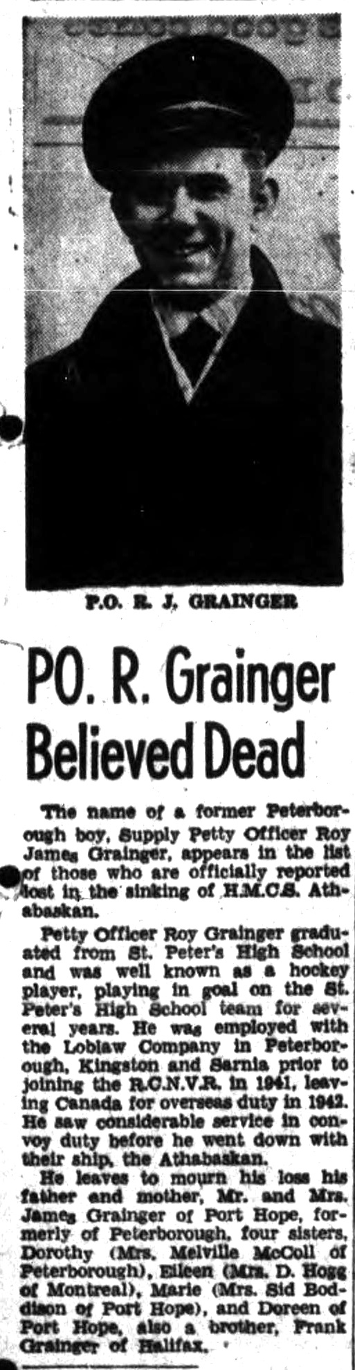 Supply PO Grainger died when his ship, HMCS ATHABASKAN G07, was sunk in the English Channel on April 29, 1944.