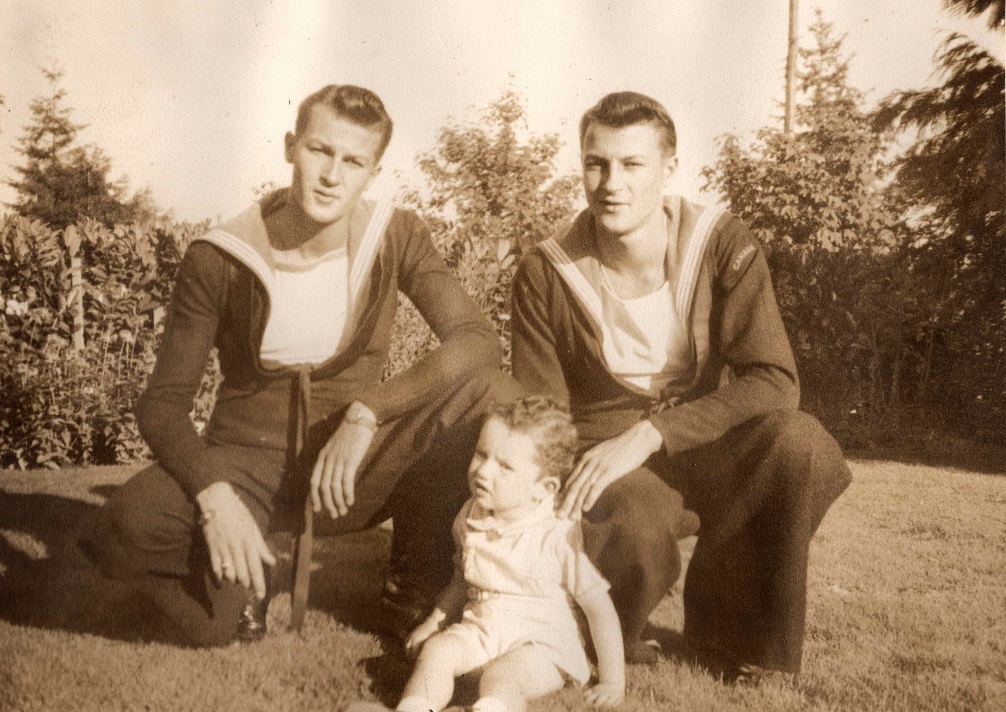 (RAH001) Twin brothers - John Murray (Jack) Hanna (left), HMCS JONQUIERE and Robert Arthur (Bob) Hanna, HMCS CHICOUTIMI with one of their younger brothers - late 1943