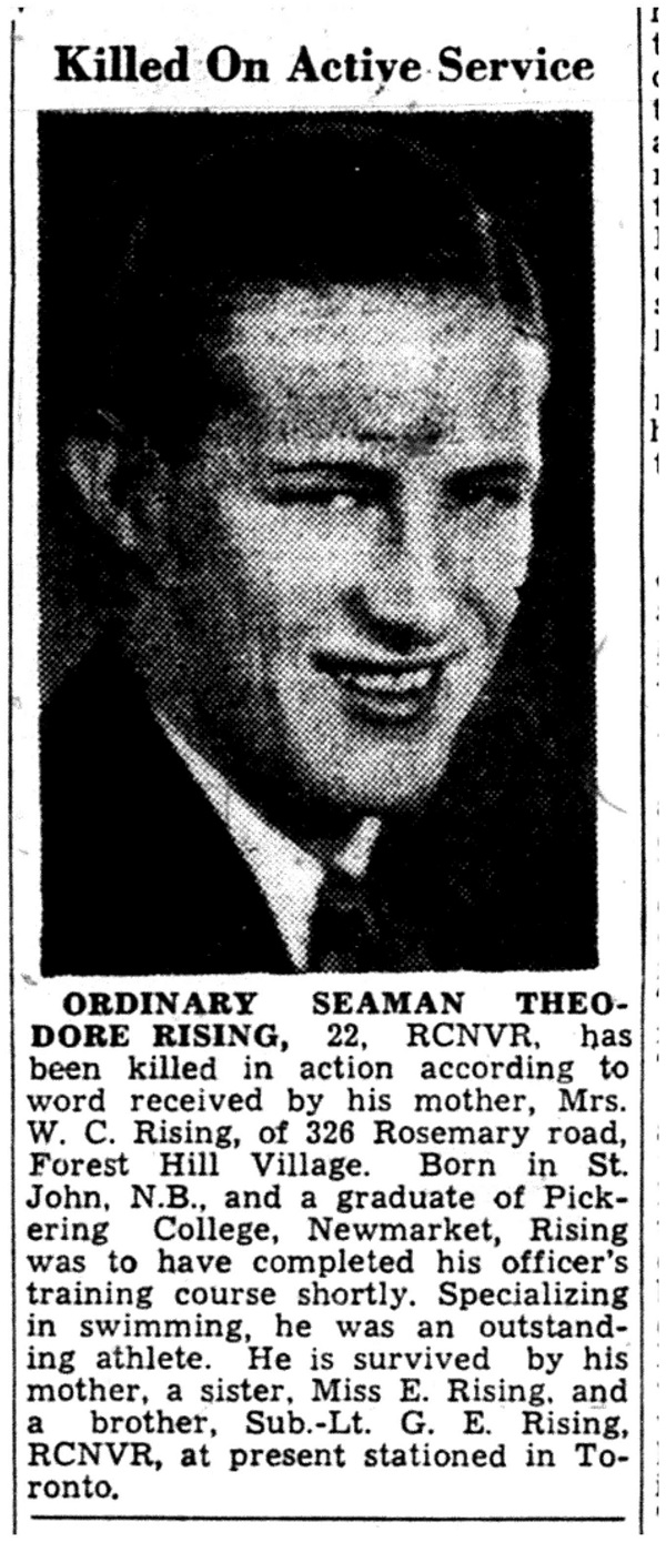 RISING, Theodore Estabrooks, OS, V2459, RCNVR, MPK - 31 Mar 1941, HMS BONAVENTURE - Son of William C. Rising, and of Elsie B. Rising, of Toronto, Ontario