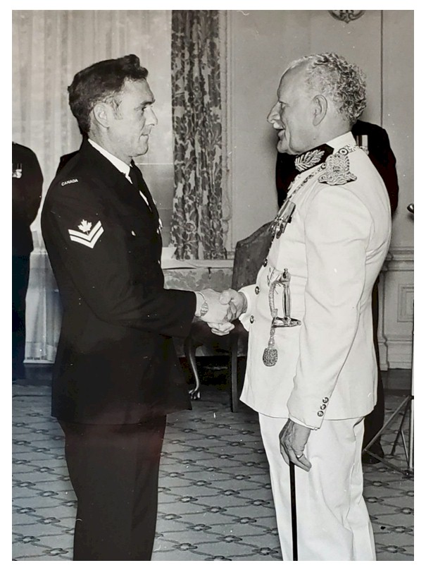 Master Corporal Gordon William Rowe - Receiving the Medal of Honor from Governor General Roland Michener, June 1973 (left) and a commendation from Lieutenant Governor Victor de Bedia Oland (right) click on the photos to view larger images