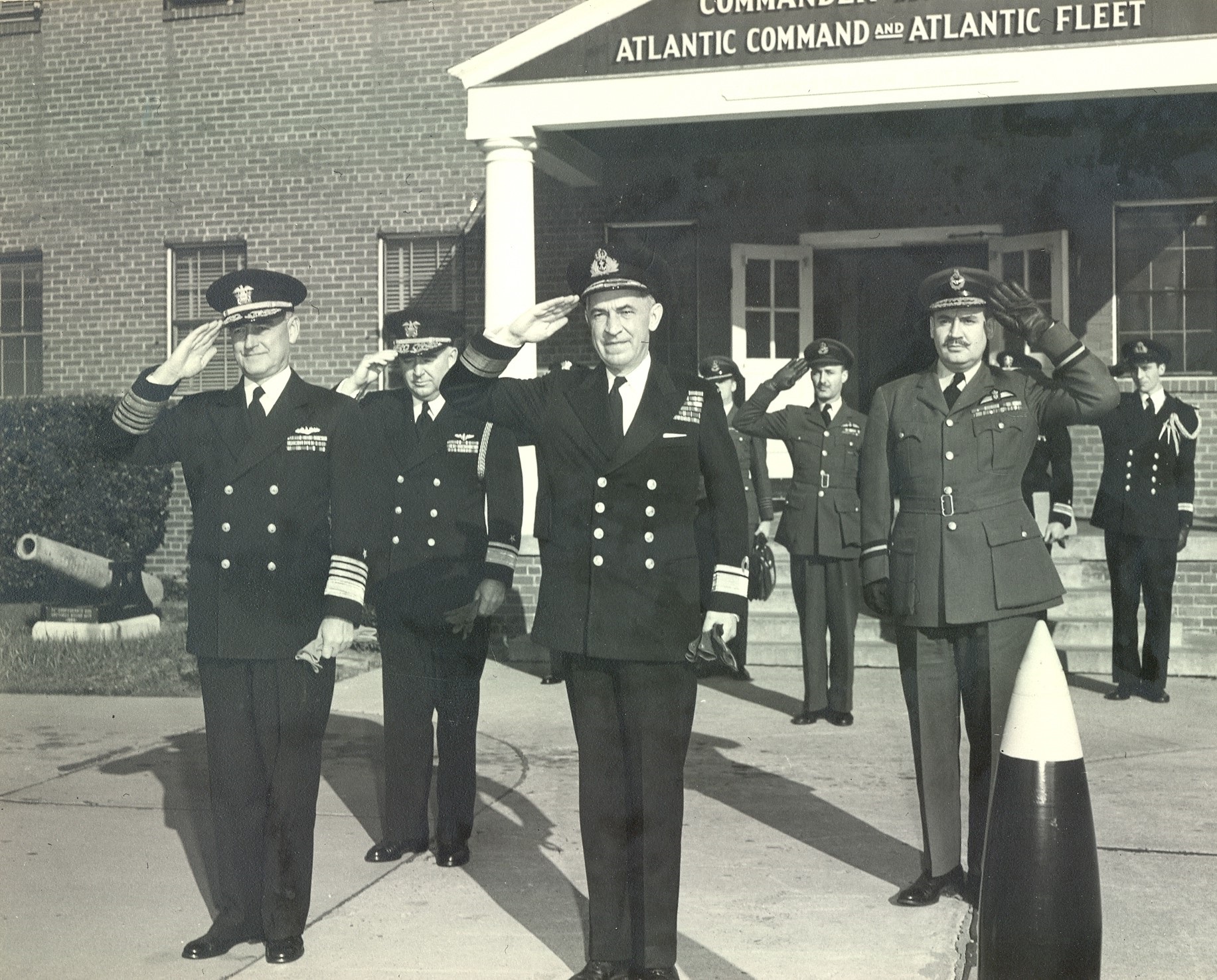 Rear-Admiral Bidwell (centre) taking the salute in front of the Atlantic Command Headquarters