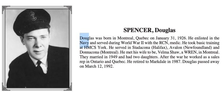 Doug's wife, Velman (née Shaw) Spencer, was a Wren during the Second World War.