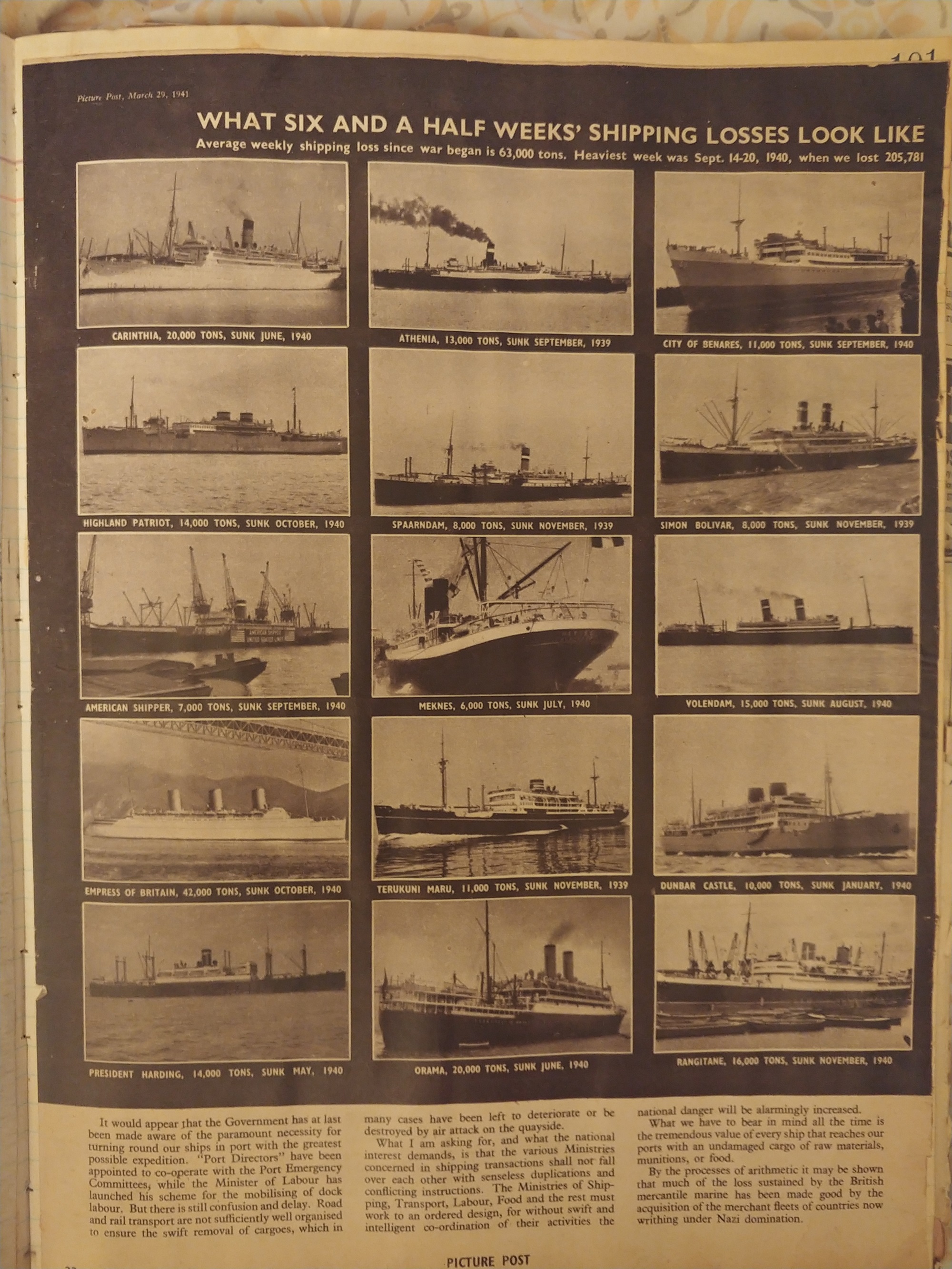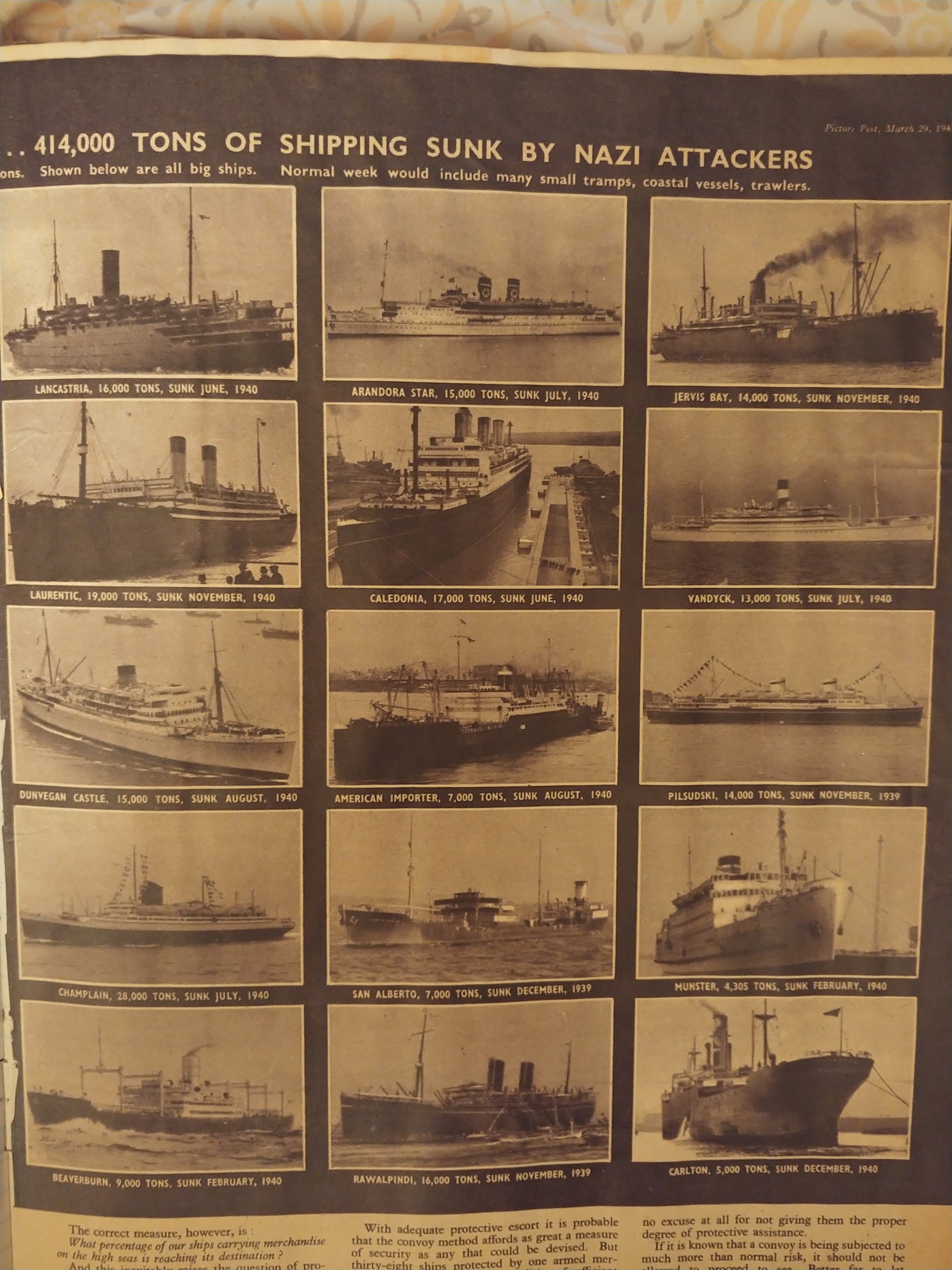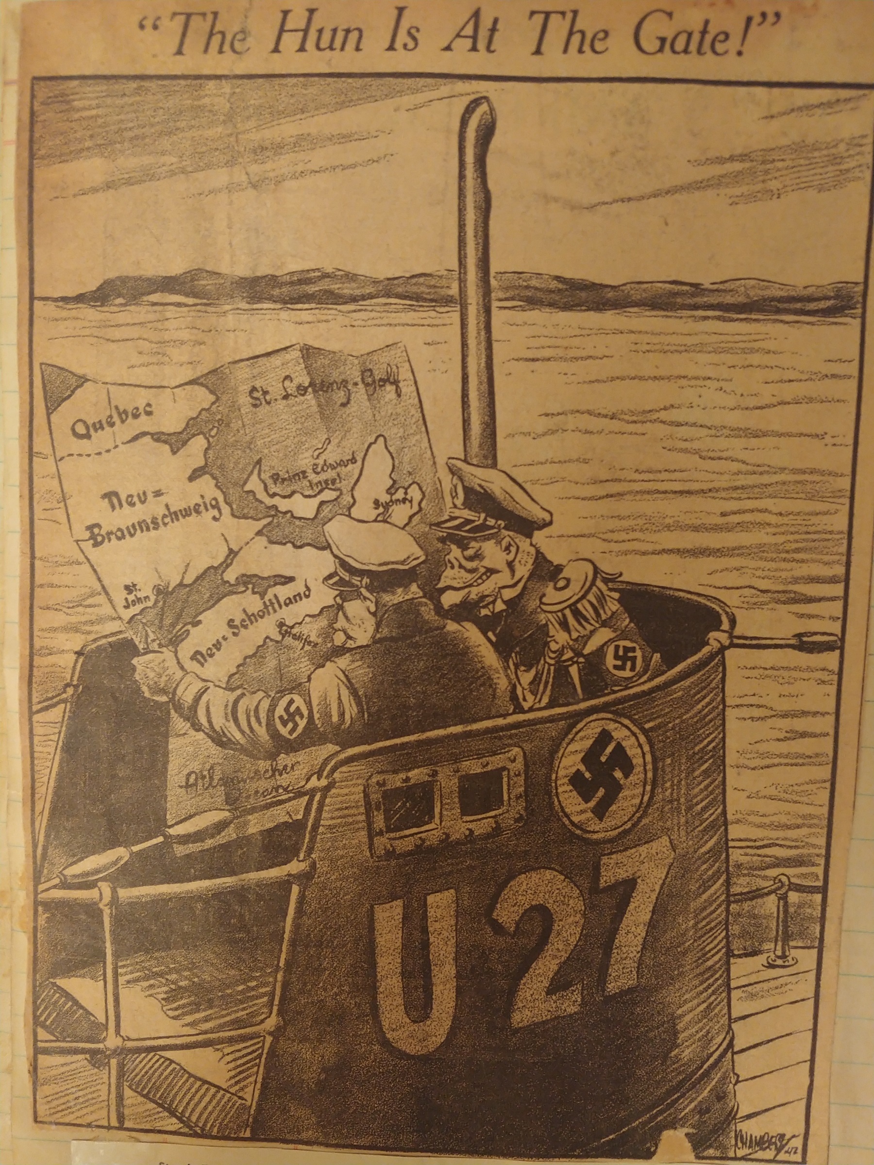 (WR13) Cartoon drawing on the U-boat threat to Canada's Atlantic coast (WR14-WR15) Article on what six and one half weeks of shipping losses looks like