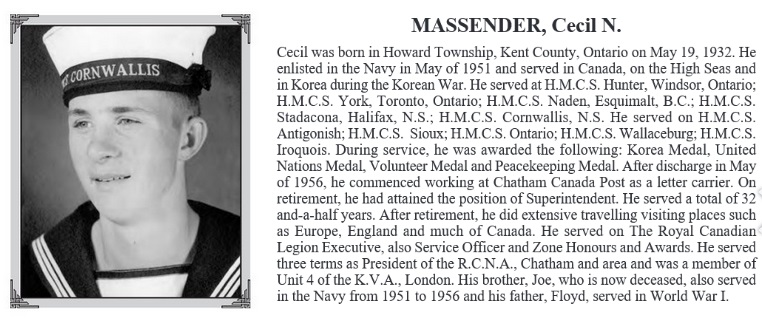 MASSENDER, Cecil Nelson - A resident of Chatham, Cecil Massender passed away at the Chatham-Kent Hospice on August 27, 2023 at the age of 91.