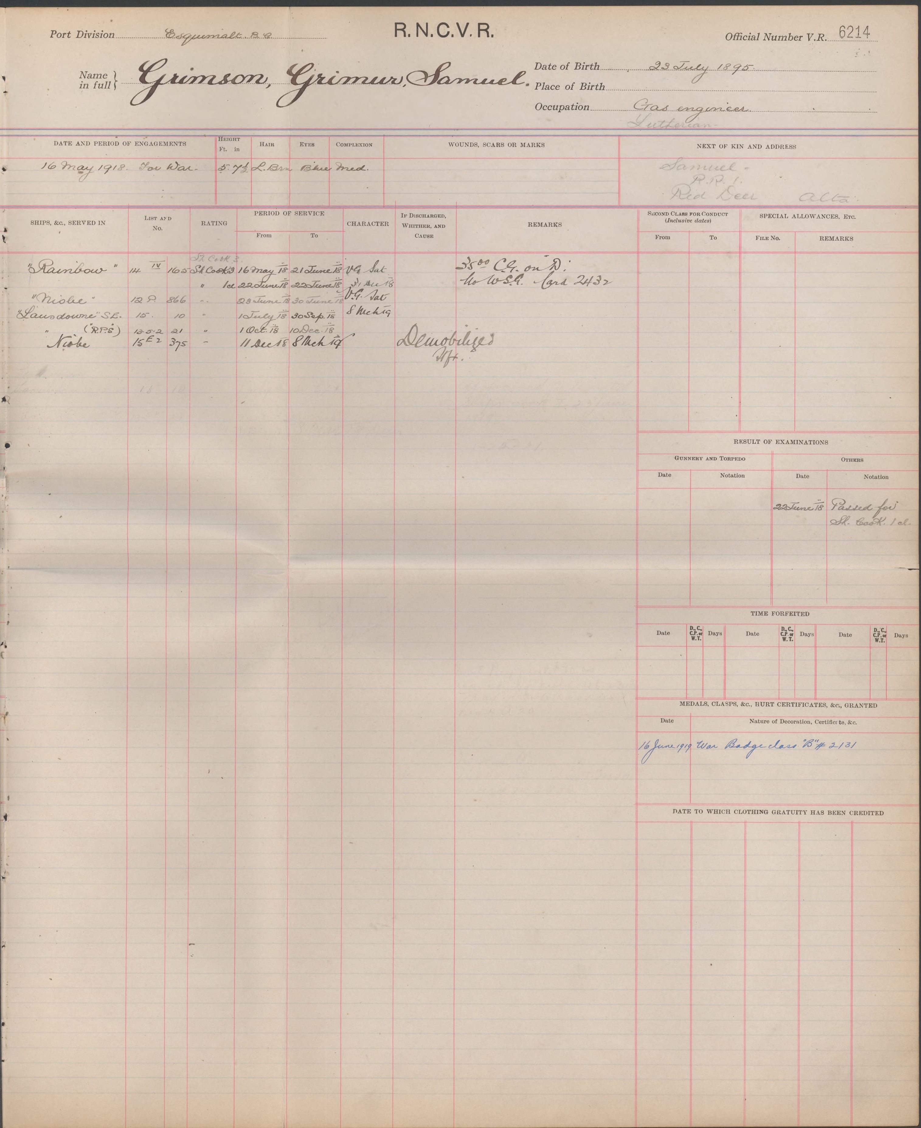 Grimur Grimson enlisted in the Canadian Army, Alberta Regiment, 1st Depot Battalion on 13 May 1918 in Calgary, Alberta.  He was discharged the same day due to being accepted in the RNCVR. Grimur was working as a Gas Engineer prior to joining the Navy.  He is buried in the Lakeview Cemetery, Sylvan Lake, Alberta.