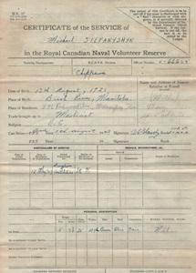 Ships served in: HMCS CHIPPAWA - Enlisted 12 May 1943. Commenced Active Service 28 Jul 1943 as a Sto 2c, RCNVR HMCS CORNWALLIS - Drafted to CORNWALLIS 13 Sep 1943 HMCS STADACONA - Drafted to STADACONA 27 Nov 1943 HMCS GUYSBOROUGH - Drafted to GUYSBOROUGH 05 Jan 1944 HMCS STADACONA - Drafted to STADACONA 01 Feb 1944 HMCS SHELBURNE - Drafted to SHELBURNE 26 Feb 1944 * Rated Sto 1c 28 Jul 1944 HMCS PEREGRINE - Drafted to PEREGRINE 10 Jan 1945 HMCS KENORA - Drafted to KENORA 25 Jan 1945 HMCS PEREGRINE - Drafted to PEREGRINE 05 Oct 1945 HMCS CHIPPAWA - Drafted to CHIPPAWA 01 Nov 1945 * Demobilized 18 Dec 1945
