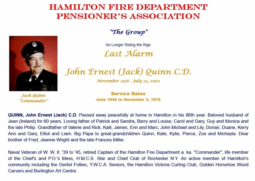 Naval Veteran of W.W.II, '39 to '45, retired Captain of the Hamilton Fire Department a.k.a. 'Commander', life member of the Chief's and P. O.'s Mess, H.M.C.S. Star and Chiefs Club of Rochester N.Y. An active member of Hamilton's community including the Geritol Follies, Y.W.C.A. Seniors, the Hamilton Victoria Curling Club, Golden Horseshoe Wood Carvers and Burlington Art Centre.