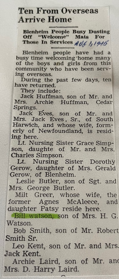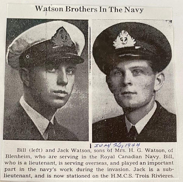 Ships served in: TORONTO DIVISION RCNVR - attached as a Prob. SLt, RCNVR (Navy List 1942) GIVENCHY (Depot Ship) - Appointed to GIVENCHY 30 Aug 1942 add'l for Disposal as a SLt, RCNVR (seniority 27 Apr 1942) (Navy List Sep 1942). Bill indicated that he served at Royal Roads - so he may have been loaned there from GIVENCHY. RCN BARRACKS ESQUIMALT - Appointed to RCN BARRACKS ESQUIMALT, Combined Operations School 01 Jul 1943 as a SLt, RCNVR (Navy List Aug 1943) HMCS NIOBE - Appointed to NIOBE for Combined Operations UK as a SLt, RCNVR (Navy List Oct 1943) LCI(L) 177 - Appointed to LCI(L) 177 04 Dec 1943 as a SLt, RCNVR (Navy List Feb 1944). Served in LCI(L) 177 during the D-Day landings. * Appointed A/Lt, RCNVR 15 Jan 1944 (Navy List Feb 1944) LCI(L) 301 - Appointed to LCI(L) 301 as an A/Lt, RCNVR (Navy List Sep 1944) HMCS KINGS - Appointed to KINGS for Short "N" Course 06 Nov 1944 as an A/Lt, RCNVR (Navy List Nov 1944) HMCS LUNENBURG - Appointed to LUNENBURG 06 Jan 1945 as a Lt (n) (seniority 27 Apr 1943), RCNVR (Navy List Mar 1945) * No further entries noted in the Navy Lists after Mar 1945