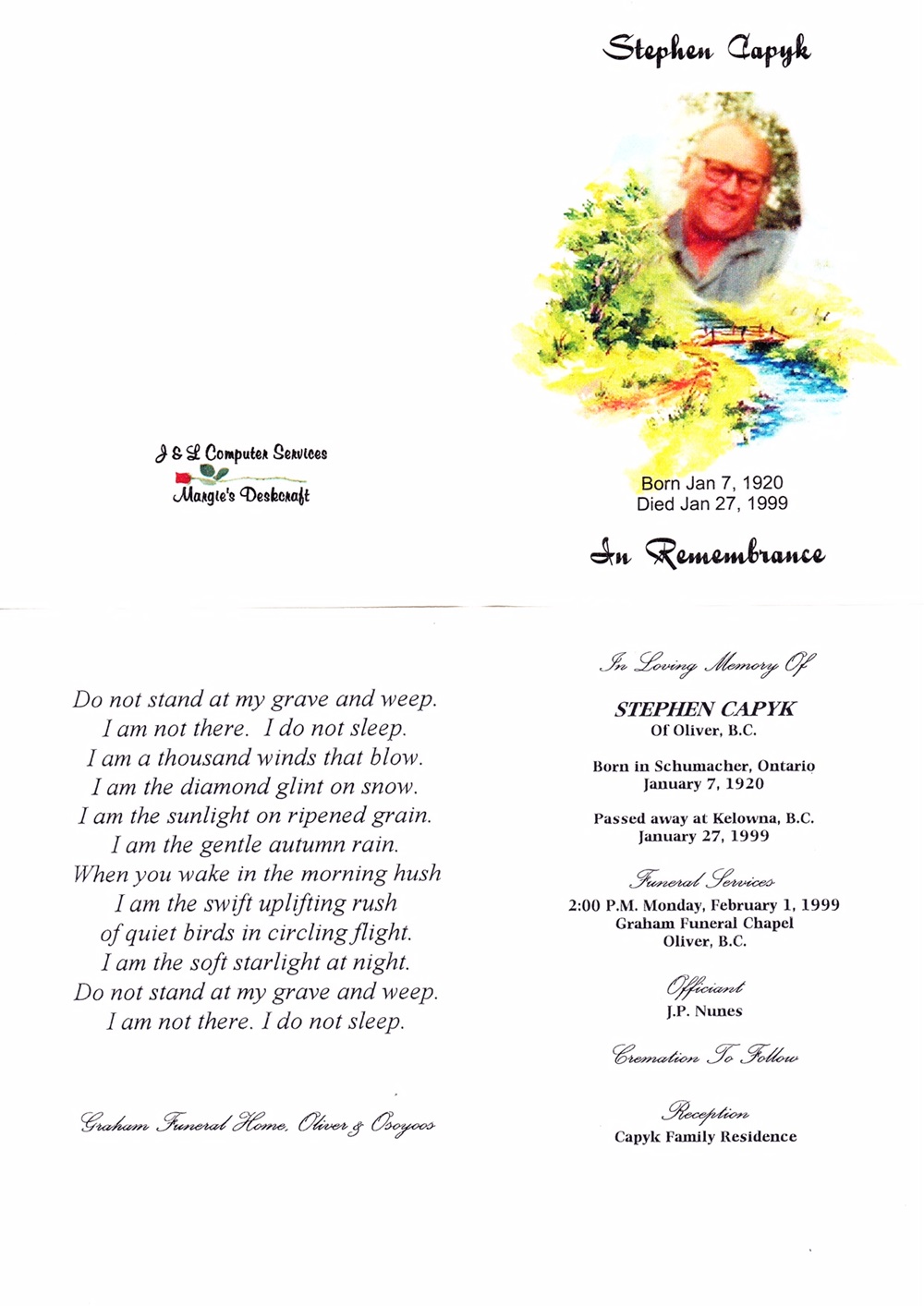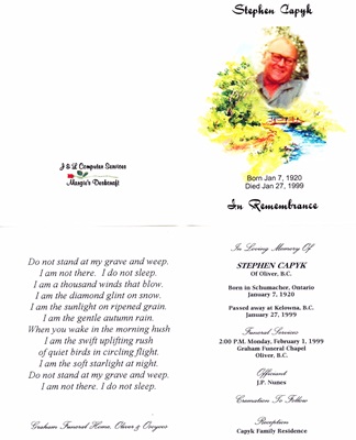 CAPYK, Stephen (Steve) - Veteran WWII - Navy. On Wednesday, January 27, 1999, Steve Capyk, age 79, beloved husband of Mary. Dear father of John (Doris), Rick (Susan), Alan (Martha). Lovingly remembered by 7 grandchildren and 1 great-granddaughter. Service was held in Oliver, BC, followed by cremation. Donations to a local charity of your choice.