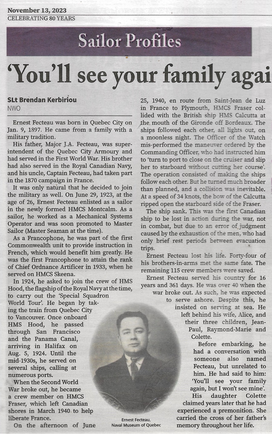 (below) Article on Ernest Fecteau from the RCN's Lookout Newspaper 13 Nov 2023