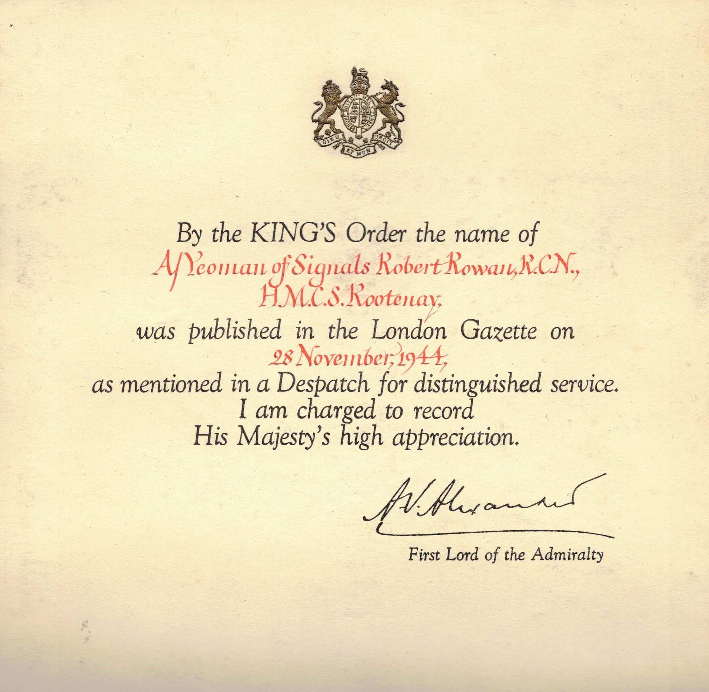 (RR00) Signalman Robert Rowan (RR01) Certificate of Service for Robert Rowan (RR02) Certificate for Mentioned in Despatches for A/Yeoman of Signals Robert Rowan