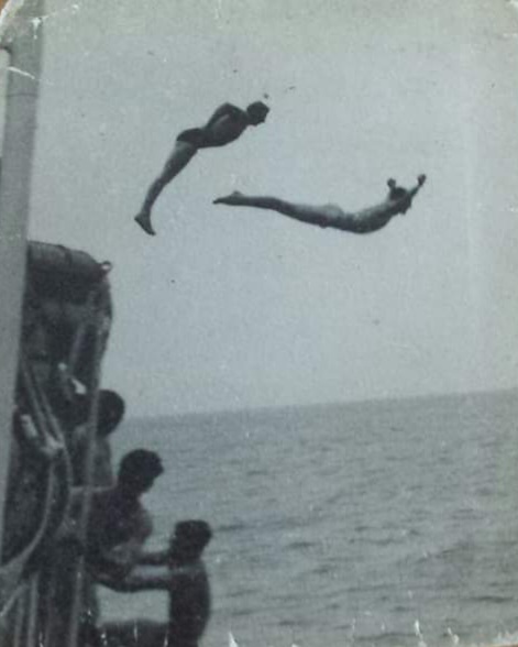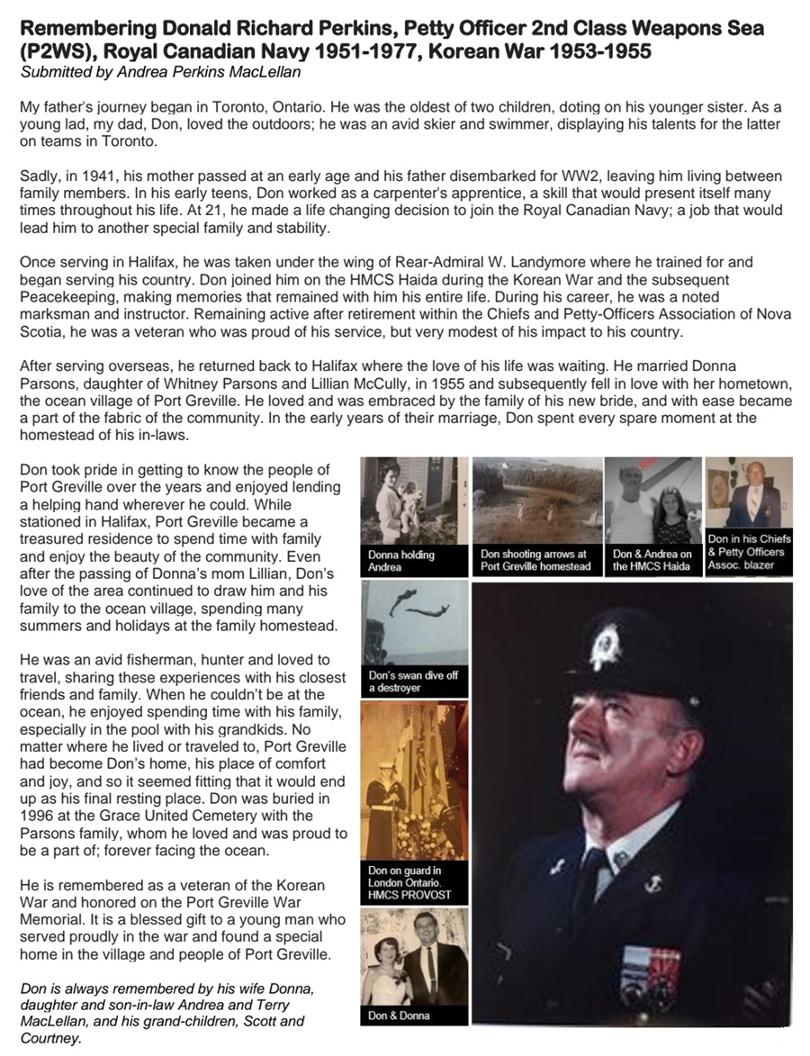 (DP01) Sailors on new entry training at HMCS CORNWALLIS (DP02) Sailors off HMCS SAULT STE MARIE in Kure, Japan 16 Mar 1954 (DP03) Donald Perkins on unknown ship (DP04) Donald Perkins as sentry on the cenotaph at a Remembrance Day Service while drafted to HMCS PREVOST (DP05) Donald taking a swan dive off an unknown ship