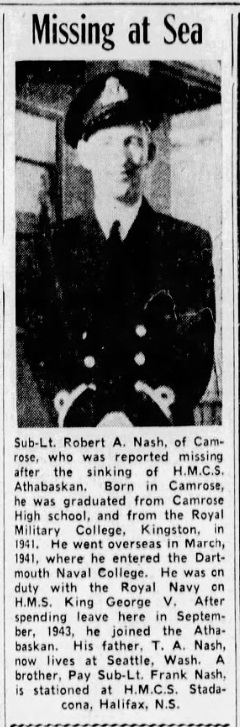 SLt Nash died when his ship, HMCS ATHABASKAN, was torpedoed and sunk in the English Channel on 29 Apr 1944. His body was recovered and he was buried in the Plouescat Communal Cemetery, Finistere, France. The province of Alberta honoured Sub-Lieutenant by naming Nash Lake in his honour.