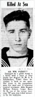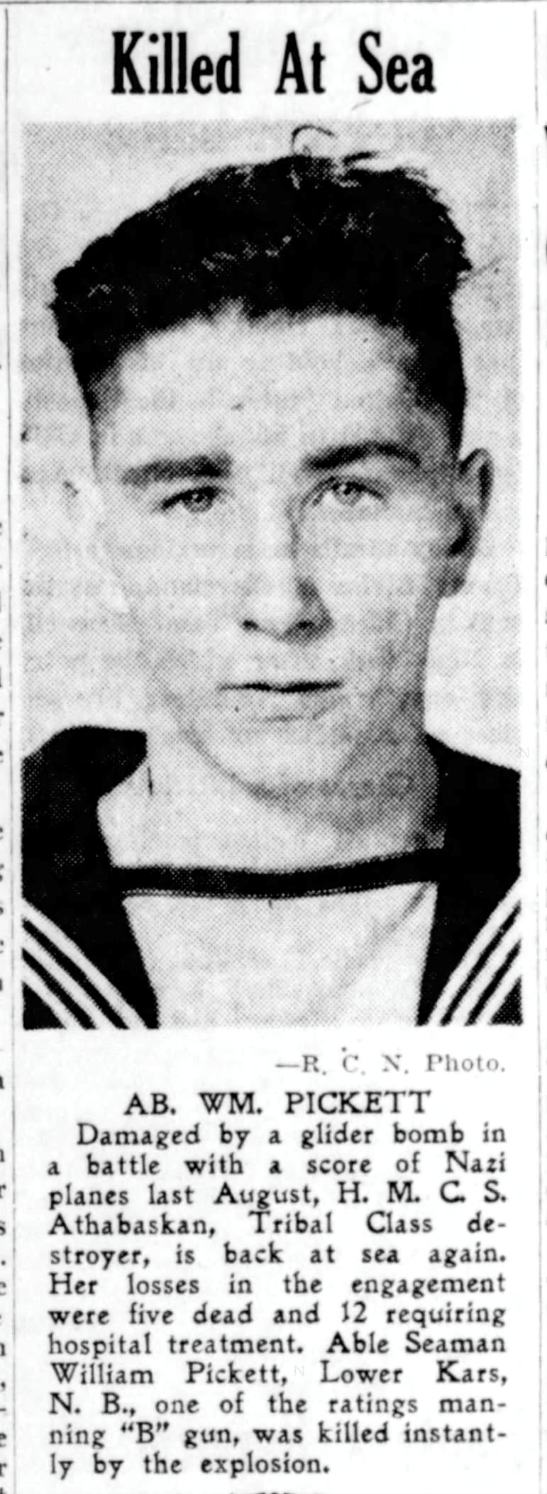 PICKETT, William Nutter, AB, V2987, RCNVR, killed - 27 Aug 1943, HMCS ATHABASKAN - Son of Isaac C. and Annie May Pickett, of Lower Kars, New Brunswick.