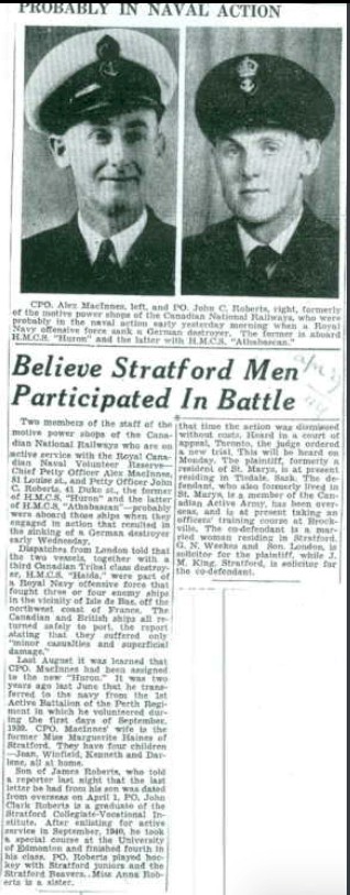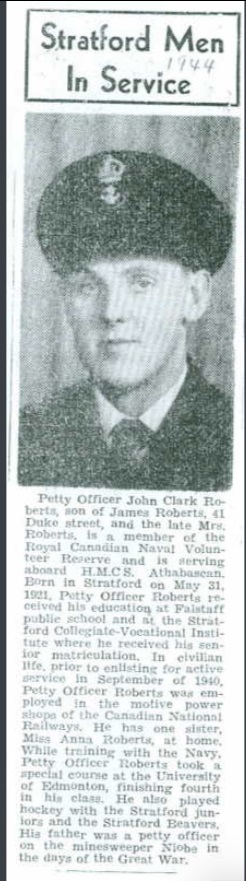 ROBERTS, John Clark, ERA 4c, V41069, RCNVR, MPK - 29 Apr 1944, HMCS ATHABASKAN - Son of James and Elizabeth Roberts, of Stratford, Ontario.