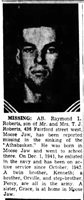 MISSING: AB Raymond L. Roberts, son of Mr. and Mrs. T.J. Roberts, 436 Fairford street west, Moose Jaw, has been reported missing in the sinking of the Athabaskan. He was born in Moose Jaw and went to school there. On Dec. 1, 1941, he enlisted in the navy and has been on active service since October, 1942. A twin brother, Kenneth; a brother, Orville, and step-brother, Percy, are all in the army. A sister, Grace, is at home in Moose Jaw. (The Regina Leader-Post 08 May 1944)