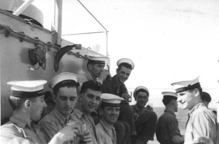 Up Spirits - Quarterdeck of HMCS JONQUIERE 318 - 1955 Front row first on left, ABQM Carl Jensen; 4th from left LSRP Jim McTavish; Front right corner LSRC John (Ike) Templeton. Back row 2nd from the left, LSRP S. Hlasny; 3rd from the left LSLR Harry Reynolds