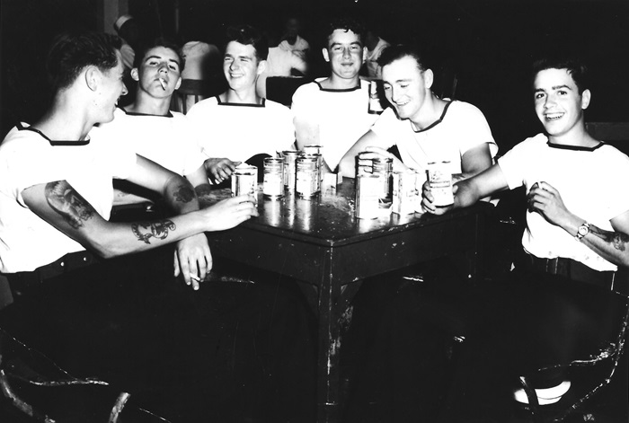 A messdeck on HMCS ATHABASKAN 1952 John Templeton 4th from right