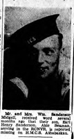 AB Sanderson died when his ship, HMCS ATHABASKAN, was torpedoed and sunk in the English Channel on 29 Apr 1944.