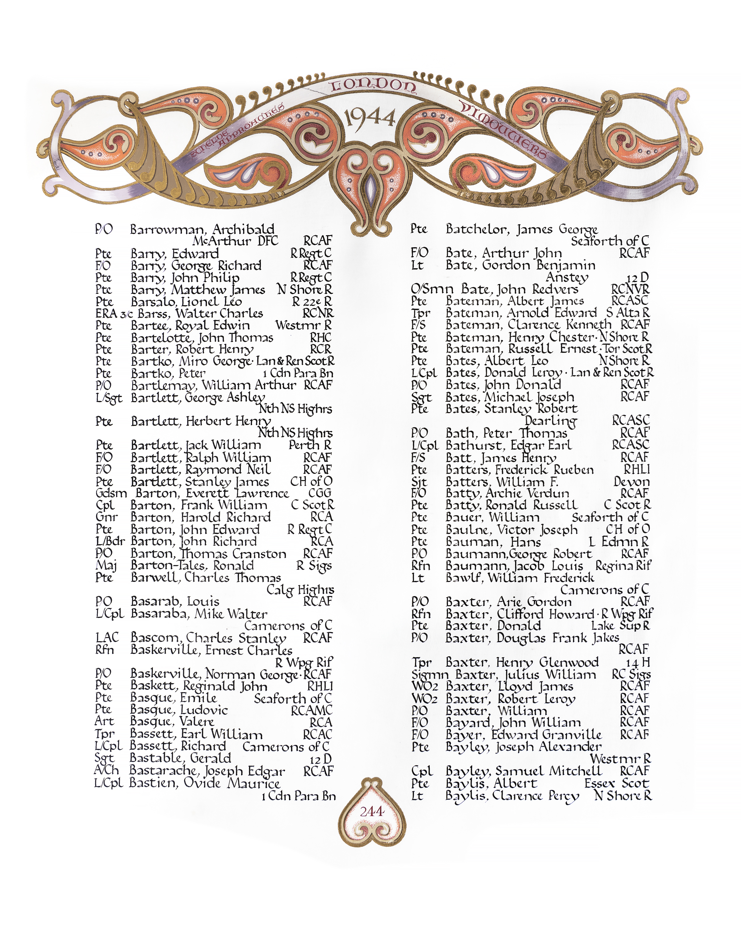 Ships served in: LONDON DIVISION RCNVR - Enlisted 22 Nov 1940. Commenced Active Service 07 Apr 1941 as an Ordinary Seaman, RCNVR HMCS STADACONA - Drafted to STADACONA 12 Aug 1941 * Rated Acting Layer Rating 3rd Class 24 Oct 1941 HMS QUEBEC (Royal Navy Combined Operations Base) - Drafted to QUEBEC 28 Feb 1942 * Rated Able Seaman, RCNVR 07 Apr 1942 * Rated Acting Leading Seaman, RCNVR (while in Combined Operations) 04 Nov 1942 * Rated Acting Cox'n Combined Operations 04 Nov 1942 HMS COPRA - Drafted to COPRA 01 Sep 1943 HMCS NIOBE - Drafted to NIOBE 09 Oct 1943 HMCS STADACONA - Drafted to STADACONA 12 Oct 1943 HMCS GIVENCHY - Drafted to GIVENCHY 23 Oct 1943 * Rated Cox'n Combined Operations 03 Nov 1943 HMCS GIVENCHY III - Drafted to GIVENCHY III 03 Dec 1943 HMCS GIVENCHY - Drafted to GIVENCHY 07 Dec 1943 * Acting Leading Seaman Relinquished. Rated Able Seaman, RCNVR 20 Dec 1943 HMCS PRINCE DAVID - Drafted to PRINCE DAVID 20 Dec 1943 HMCS NIOBE - Drafted to NIOBE 19 Mar 1944 HMCS ATHABASKAN - Drafted to ATHABASKAN 25 Apr 1944