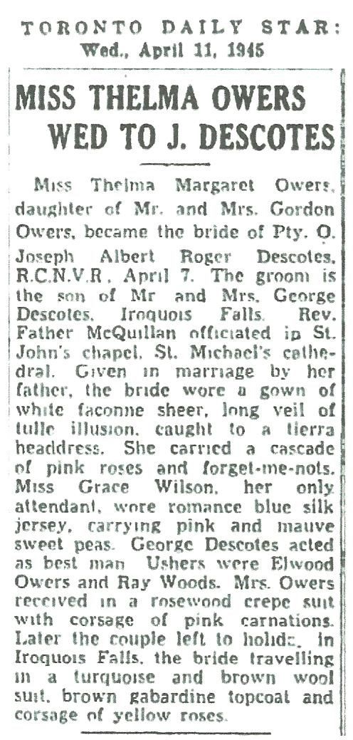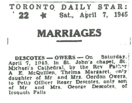 announcement for Joseph Descotes and Thelma Margaret Owers The