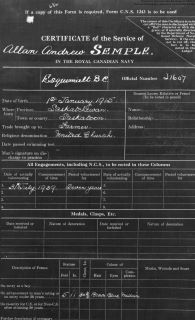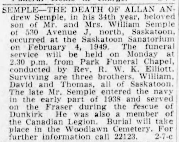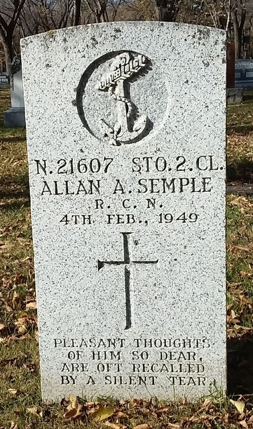 Allan Semple's family came from Ayreshire, Scotland, and settled in the Gardenvilla district just northeast of Saskatoon in 1923. Allan joined the Navy in 1934 and was wounded in the sinking of HMCS Fraser in 1940. Invalided home, he died in 1949 at age 34 purportedly of his war wounds. Although Semple's name appears on the Saskatoon Rural honour roll, only deaths occurring before the end of 1947 are considered as war casualties by the Canadian government. (source: "Age Shall Not Weary Them: Saskatchewan Remembers Its War Dead" 2005, Bill Barry p 497).