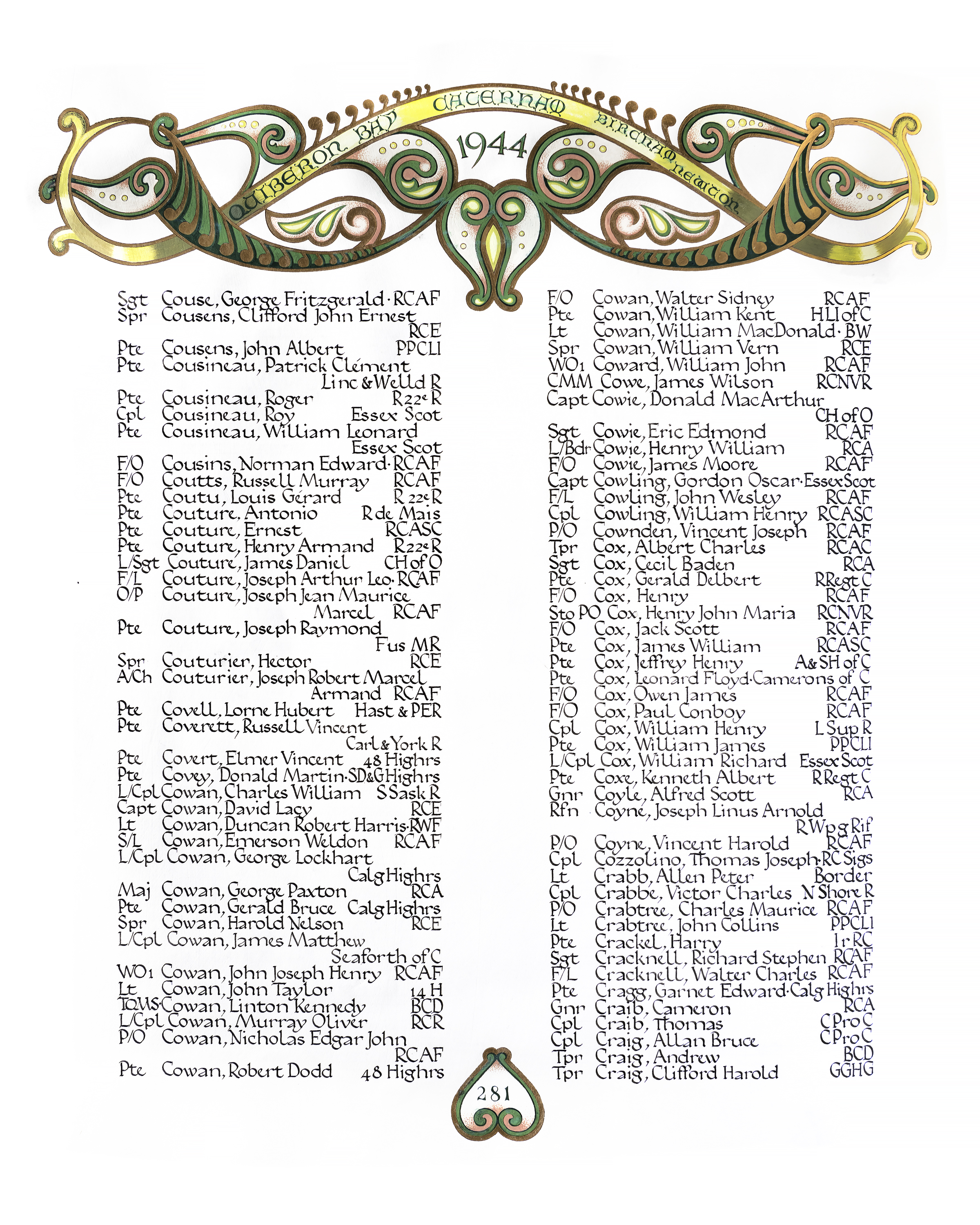 Ships served in: HMCS CHIPPAWA - Enlisted 06 Aug 1943 as a Sto 1st Class, RCNVR * Rated Stoker Petty Officer 07 Aug 1943 * Commenced Active Service 25 Aug 1943 HMCS CORNWALLIS - Drafted to CORNWALLIS 27 Sep 1943 HMCS CHIPPAWA - Drafted to CHIPPAWA 27 Sep 1943 HMCS CORNWALLIS - Drafted to CORNWALLIS 25 Oct 1943 HMCS SAGUENAY - Drafted to SAGUENAY 21 Dec 1943 HMCS CORNWALLIS - Drafted to CORNWALLIS 24 Dec 1943 HMCS SAGUENAY - Drafted to SAGUENAY 30 Dec 1943 HMCS CORNWALLIS - Drafted to CORNWALLIS 15 Feb 1944 HMCS STADACONA - Drafted to STADACONA 19 Feb 1944 HMCS ALBERNI - Drafted to ALBERNI 19 Apr 1944