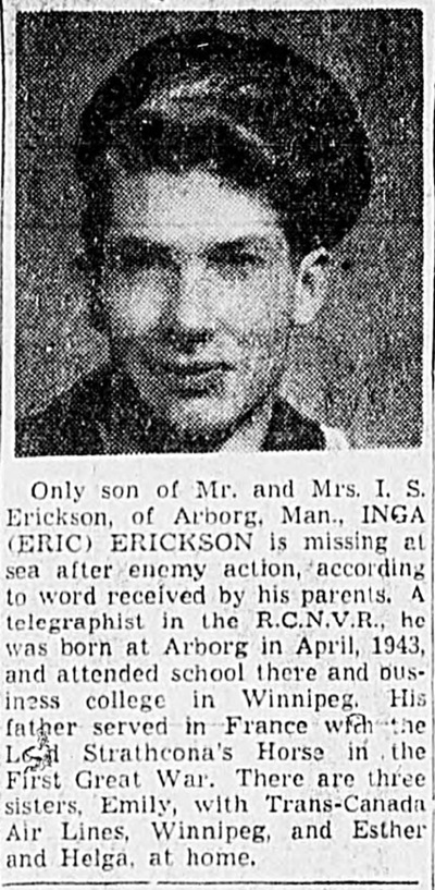 ERICKSON, Ingvi Swain, Telegraphist, V51886, RCNVR, MPK - 21 Aug 1944, HMCS ALBERNI - Son of Ingvi S. and Herdis Erickson, of Arborg, Manitoba.
