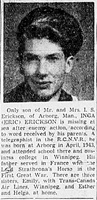 (IE01) Portrait of Telegraphist Erickson (IE02) Tel Erickson missing after the sinking of the ALBENI - Winnipeg Evening Tribune (IE03) Documents from the Service File of Ingvi Erickson