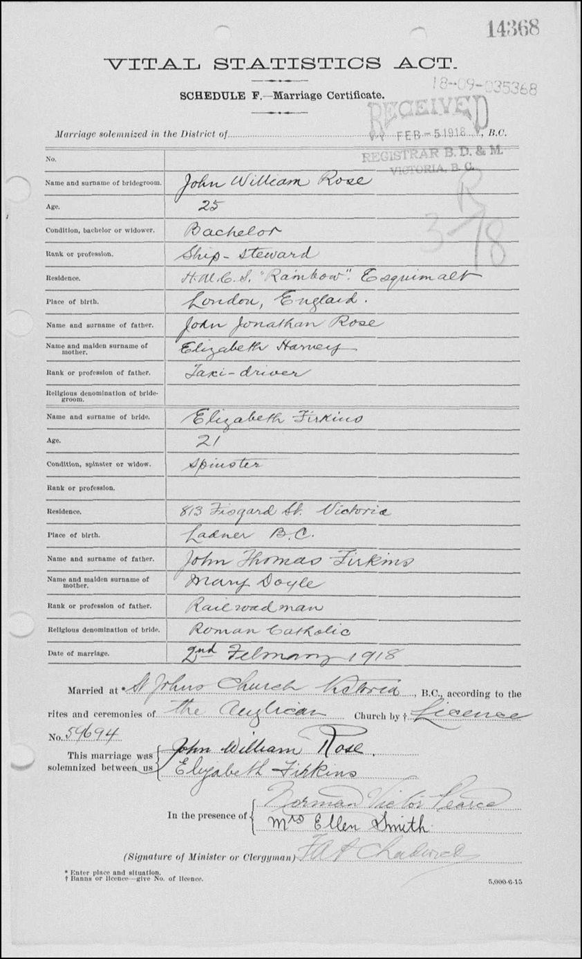CPO Rose died at the Royal Canadian Naval College, Royal Roads, British Columbia from a coronary occlusion (heart attack). John was predeceased by his parents John Jonathan Rose and Eliza Rose. He was survived by his wife Elizabeth (née Firkins) Rose; brother Harry George Rose of Vancouver, BC and sister Lilliam Hughes of England. John was a pipe fitter in civilian life prior to joining the Navy.