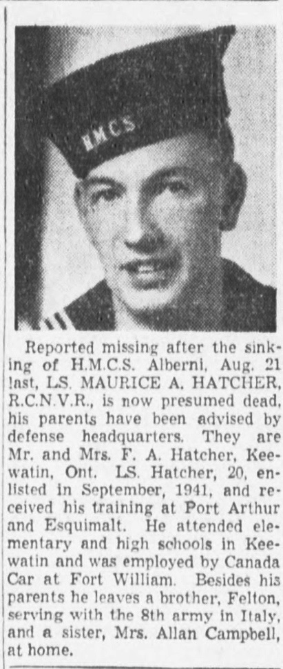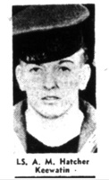 HATCHER, Arthur Maurice, LS RDF 2c, V16632, RCNVR, MPK - 21 Aug 1944, HMCS ALBERNI - Son of Felton Arthur and Margaret Hatcher, of Keewatin, Ontario.