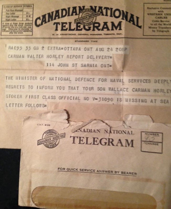 (WH01) Photo of Stoker Horley (WH02) Photo of Stoker Horley from the Toronto Telegram Sep 1944 (WH03) Telegram to Stokeer Horley's father information them that he is missing at sea (WH04) Documents from the Service File of Wallace Horley