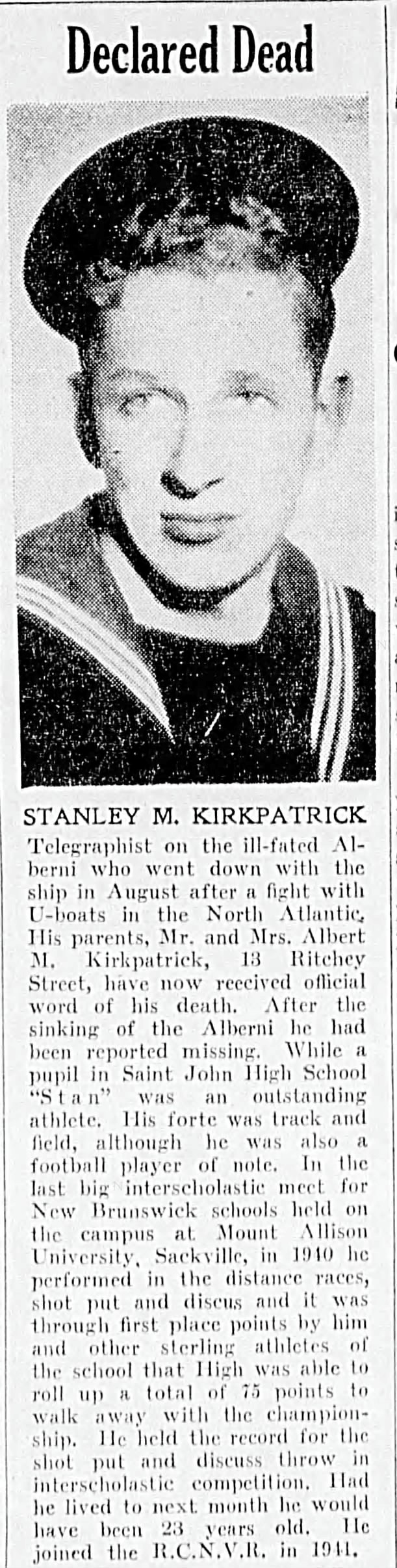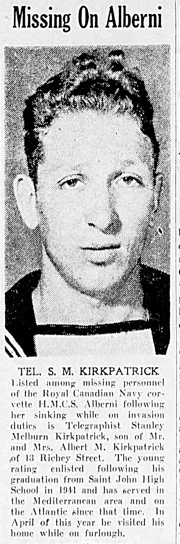 KIRKPATRICK, Stanley Melburn, Telegraphist, V2850, RCNVR, MPK - 21 Aug 1944, HMCS ALBERNI - Son of Albert Miles and Elizabeth Mary Kirkpatrick, of Saint John, New Brunswick.