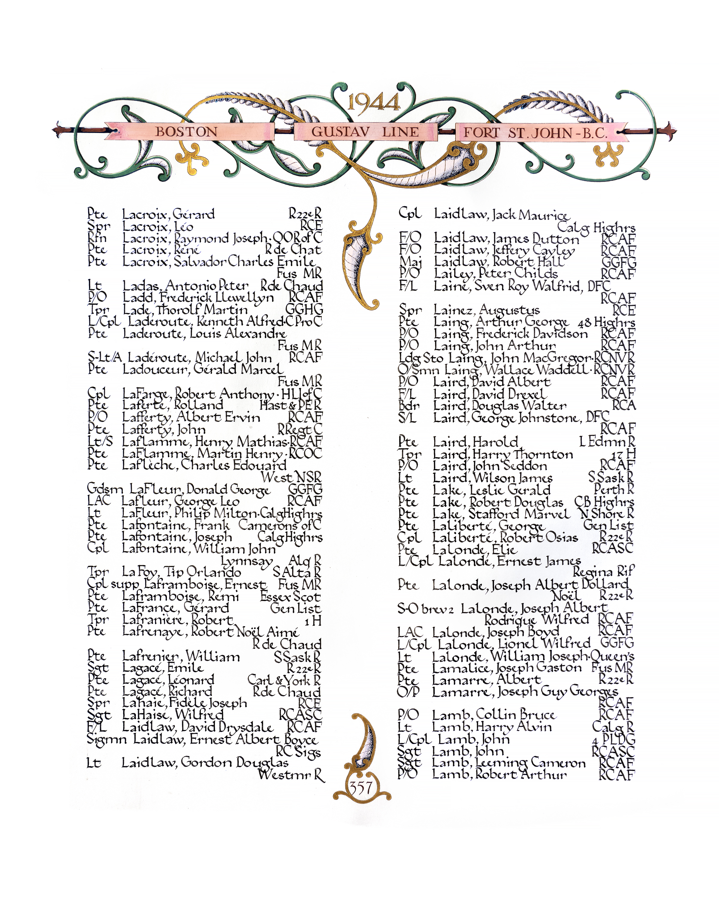 Ordinary Seaman Wallace Waddell Laing who was reported missing on August 21, while serving on H.M.C.S. Alberni, is now been presumed dead, according to word received by his parents Mr. & Mrs. John A. and Mary M. Laing, Winnipeg, Manitoba. OS W. W. Laing enlisted with R.C.N.V.R. in July 1943, trained at Winnipeg, Vancouver Island, Cornwallis and St. Hyacinthe. Born in Winnipeg and attended General Wolfe and Gordon Bell Schools and was active in sports. Prior to enlistment he was employed by the Canada Car at Fort William, and was active in scouting and Y.M.C.A. activities.