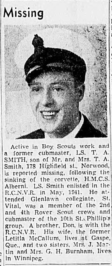 SMITH, Thomas Alfred, L/Cook, V24481, RCNVR, MPK - 21 Aug 1944, HMCS ALBERNI - Son of Thomas Alfred and Louise Smith, of Norwood, Manitoba; husband of Letitia J. Smith, of Gaspe, Quebec.