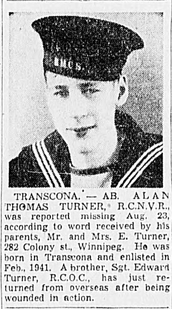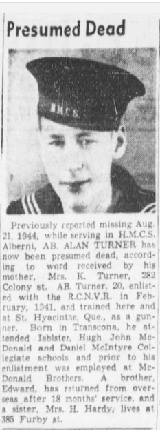 TURNER, Alan Thomas, AB AA III, V50180, RCNVR, MPK - 21 Aug 1944, HMCS ALBERNI - Son of Kathleen Turner, of Winnipeg, Manitoba.