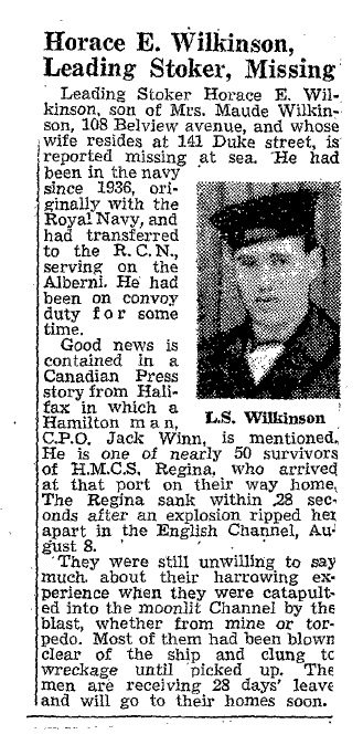 WILKINSON, Horace Edward, L/Stoker, 22129, RCN, MPK - 21 Aug 1944, HMCS ALBERNI - Son of Horace E. and Maude Wilkinson, of Hamilton, Ontario; husband of Audrey M. Wilkinson, of Hamilton.