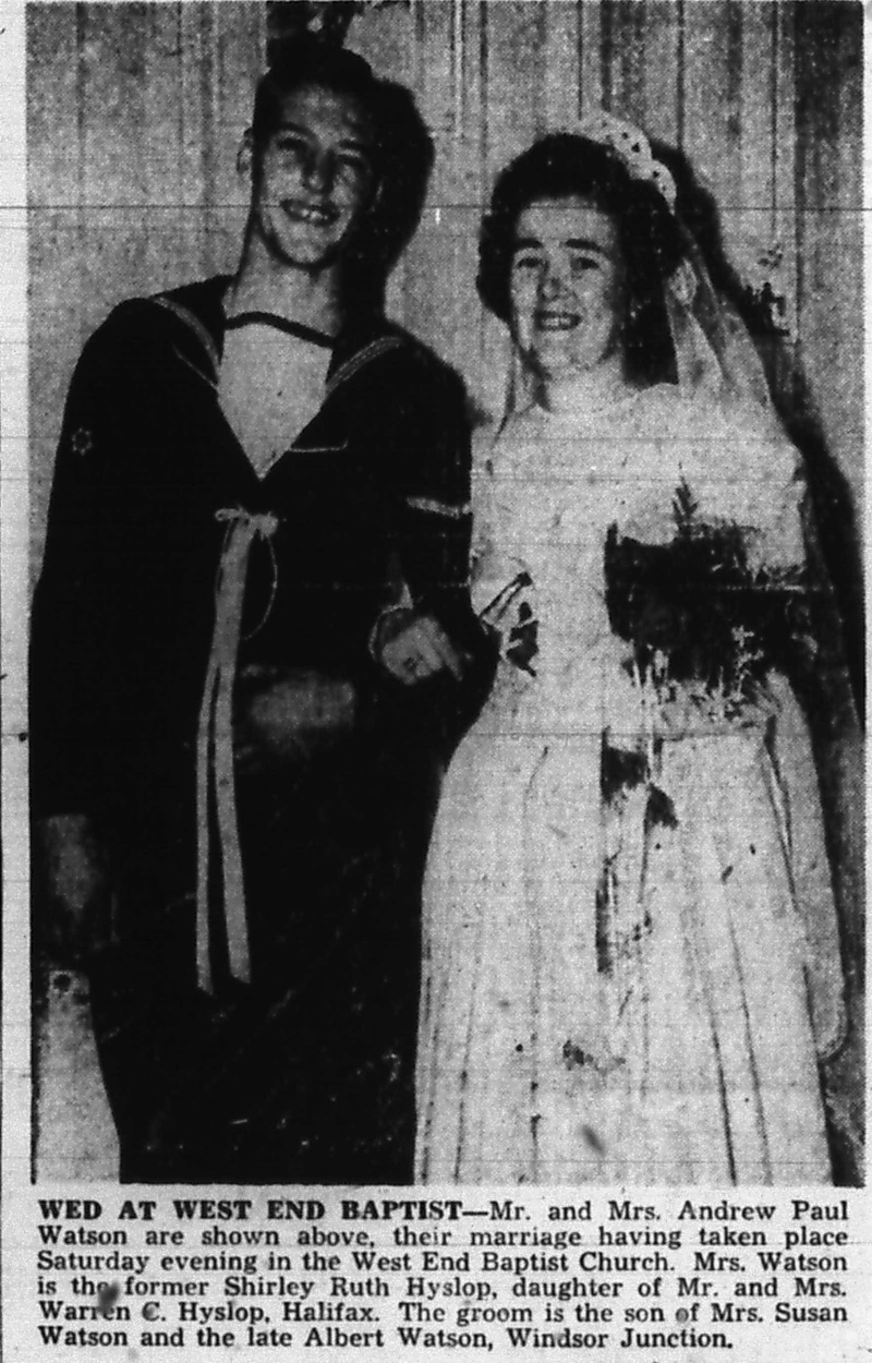 WATSON, Andrew Paul - passed away quietly in his sleep after a long illness. Son of the late Albert and Suzanna (Keogh) Watson (of Windsor Junction). Andy graduated from high school at age 11 and went on to St. Ann's College for four years. He ran away and joined the Army at Aldershot but was discovered under age. He later joined the Navy where he served for 21 years as pay-writer. He was a volunteer in the Korean War. He enjoyed sports and taught both girls and boys hockey and baseball. Andy was a fundraiser for the first Windsor Junction Community Centre. He loved to garden, do preserves and cook. He could knit well and made sweaters, mitts and caps, in later years sending mitts and caps to the Indian children at the South Dakota Indian Reserve. He gave most of his garden away. He enjoyed a good joke or story and card playing. Andy loved attending the various Highland Games events. He was a founder of the Pipes and Drums of Clan Farquharson, a Life Member of the Clan Lamont Society of Canada, and a Life Member of the Chief and Petty Officers Association at Windsor Park and a long term member of the Royal Canadian Legion Branch 162. Formerly married to Shirley Hyslop of Truro. children, Marilyn Riggs (deceased), Paul (Janet), Andrea Little, Brian (Ruth), Terri-Lynn Collins. Survived by his wife of 37 years, Jean and stepsons, Cyril (Janet), Angus (Regina) and Reg (Kelly) MacKaracher and many grandchildren, great-grandchildren, nieces and nephews; and sister, Evelyn Roy of Moncton. Predeceased by sister, Lillian and brother, Albert. (source: Find-a-Grave)
