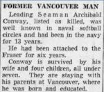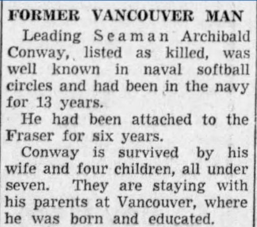 Archie attended school on Fairfield Island and at Chilliwack High School, where he was an excellent soccer player. He'd been in the navy for 13 years and was a well known softball player. LS Conway is survived by his parents, his wife Eileen Helen Conway (married 25 Nov 1932) and 4 children all under 7 years of age.
