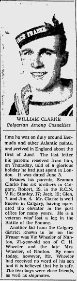 Besides his parents, Seaman Clarke has six brothers in Calgary, Robert, 19, in the RCNVR; Stanley, 17; Jack, 12; Glen, 7 and Jim, 4. William's father, Mr. Clarke is known in Calgary, having operated the elevator in the post office for many years. He is a veteran who lost a leg in the Battle of the Somme. Another lad from the Calgary district known to be on the Fraser was Vic Wheeler of Nanton, 21-year-old son of C.H. Wheeler, of Nanton. By noon today, however, Mr. Wheeler had received no word of his son and it is believed that he is safe. The two boys were close friends as well as shipmates. (Transcription for article below - WC03)