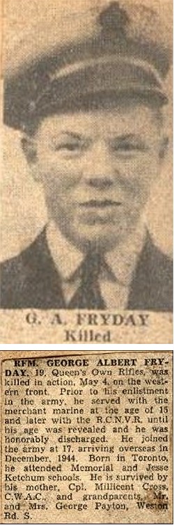 Son of Thomas and Millicent Fryday, of Toronto, Ontario; grandson of Frances Payton, of Toronto. Rifleman George Fryday was killed in action in Germany on 04 May 1945. Prior to joining the Queen's Own Rifles of Canada he had served in the RCNVR from Apr 1942 to Sep 1942. He was released from the RCNVR once they found he was underage. He is buried in the Canadian War Cemetery, Holten, Netherlands.