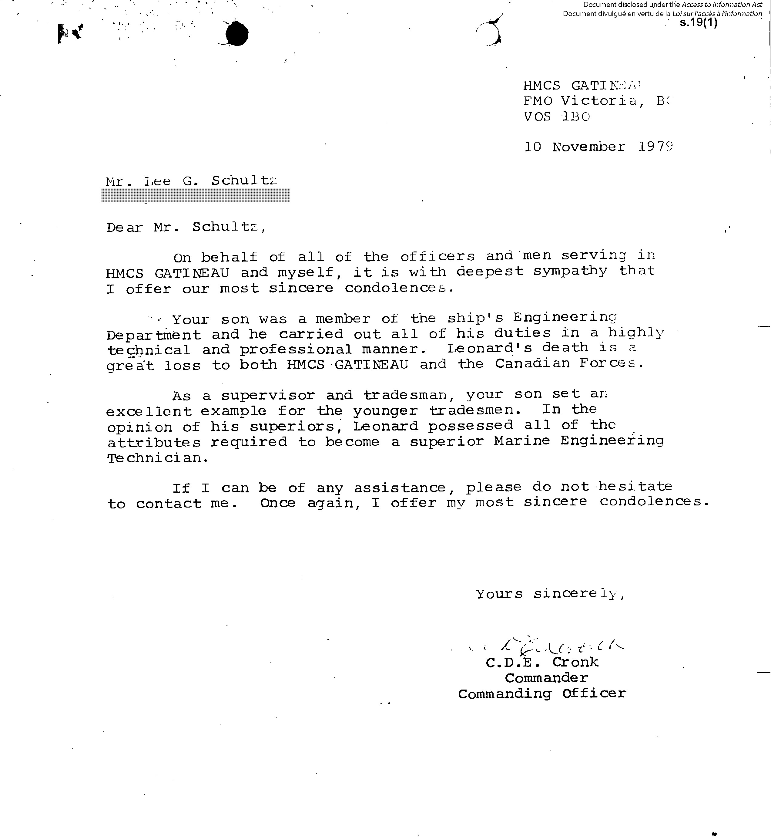 SCHULTZ, Leonard Wayne - In Victoria, B.C., on November 9, 1979, Master Seaman Leonard Wayne Schultz, Canadian Armed Forces, aged 25 years, born in Bagshaw, Alberta. He leaves his family. Service in the South Side Memorial Chapel, Edmonton, Alberta. Interment at the West Lawn Memorial Park, Edmonton, Alberta. Arrangements by the Sands Mortuary Ltd. (The Victoria Times Colonist 16 Nov 1979)