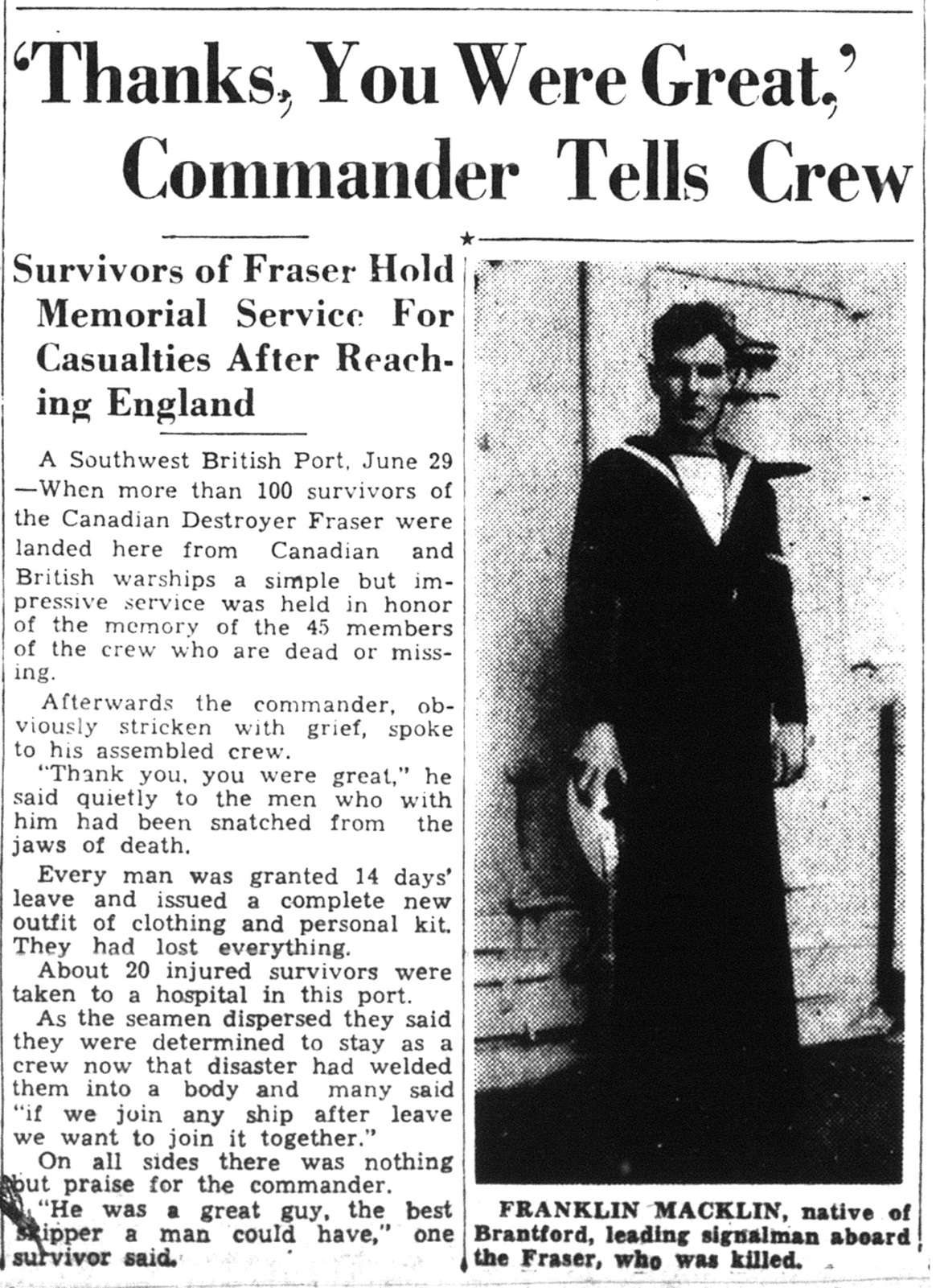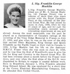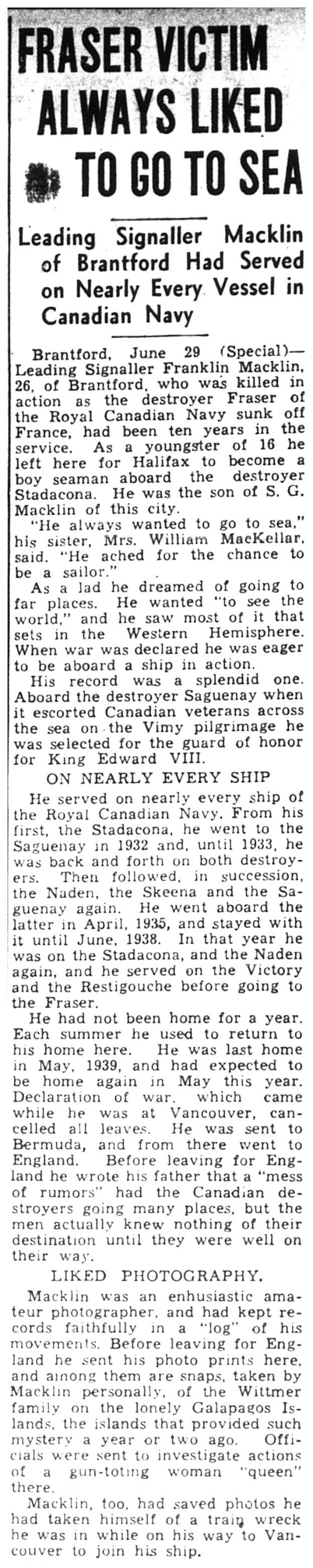 Leading Signalman Franklin George Macklin, eldest son of Mr. S. George Macklin, 145 Cayuga Street, was a veteran of more than nine years service with the Royal Canadian Navy at the outbreak of the Second Great War. He had joined its ranks in July, 1930, when he was 16 years of age, and through the succeeding years enjoyed many interesting experiences at sea and abroad. Among the most memorable was the part he played as a representative of Canada's ratings at the unveiling of the Vimy Ridge Memorial in France on July 27, 1936, and also when he was on the crew of the ship that carried Their Majesties, King George and Queen Elizabeth up the Pacific Coast on their visit to Canada in 1939. L/Sig. Macklin lost his life on the destroyer H.M.C.S. Fraser when she was sunk on June 25, 1940, and he was thus the first of Brantford's sons to give his life for King and Country in the Second Great War. He had been overseas about a month before the Fraser went down, sent over when the first ships of the R.C.N. were dispatched to Britain to engage in coastal defense work. Born in Brantford, January 01, 1914, Franklin attended King Edward School. He was employed for a short time at the Crown Electrical Manufacturing Company Ltd. He attended Zion United Church.