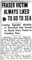 MACKLIN, Franklin George, L/Sig, 2536, RCN, MPK - 25 Jun 1940, HMCS FRASER - Son of Mr. and Mrs. Samuel Macklin, of Brantford, Ontario.