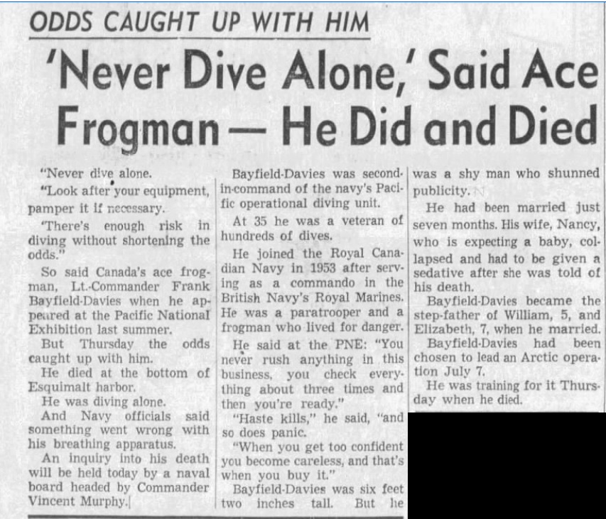 Lieutenant Commander Francis Merrick Bayfield-Davis died after his CDBA failed during diving operations at Esquimalt.