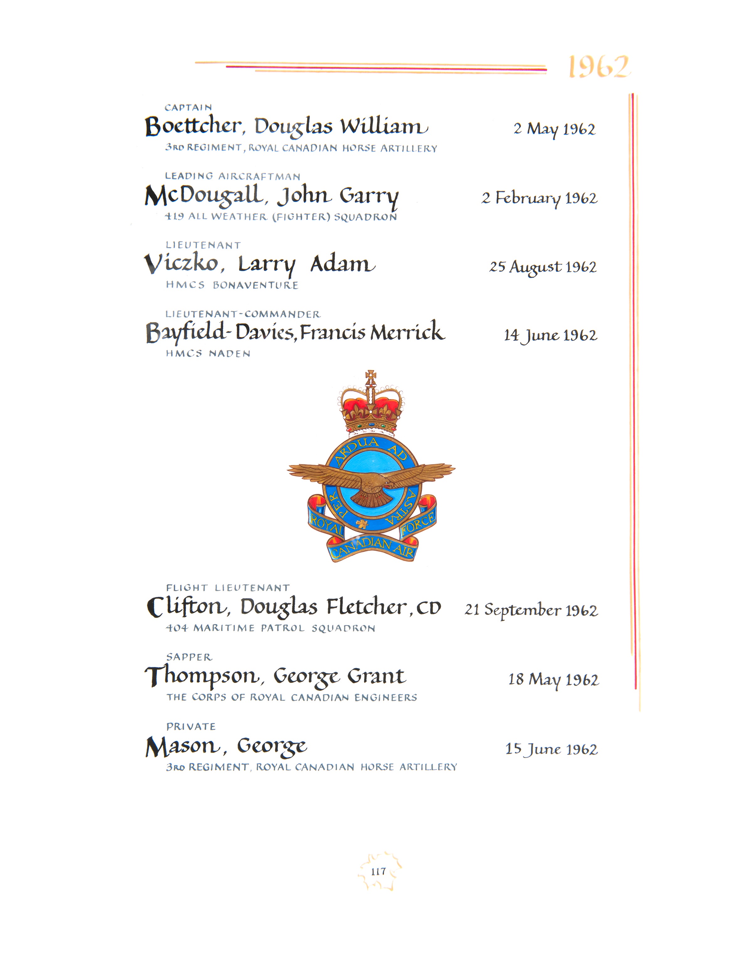 BAYFIELD-DAVIES, Francis Merrick, LCdr, RCN, died: 14 Jun 1962, HMCS NADEN - Son of Eric and Frances of East Dart Hotel, Postbridge, Devon, England. Husband of Nancy (now Campbell) and father of Helen. Brother of Cedric Harold, Alexandria and Patricia.