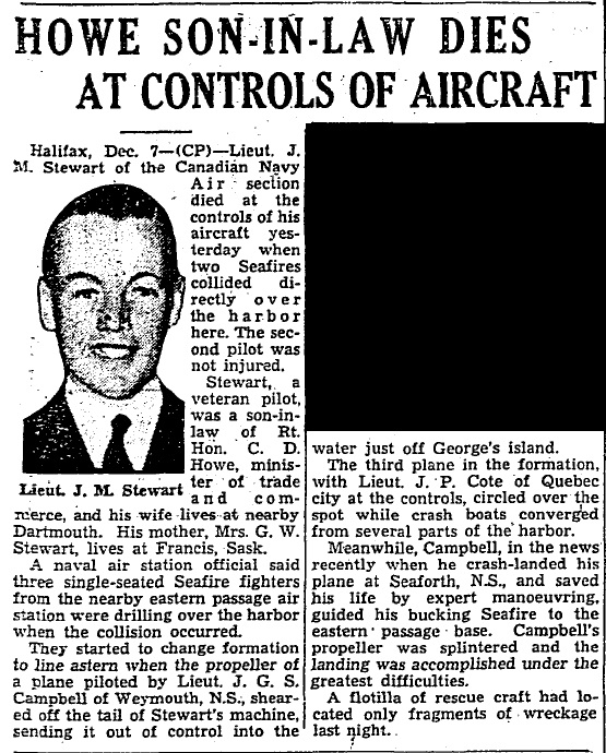 Lt Stewart died in a mid-air collision over Halifax Harbour during a training flight. He was buried at sea.